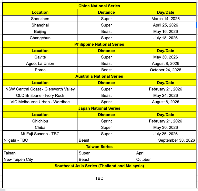 - One World Championship event per distance, includes Championships for 100M, Sprint, Super, Beast, Ultra, Trifecta, World’s Toughest Mudder and DEKA
